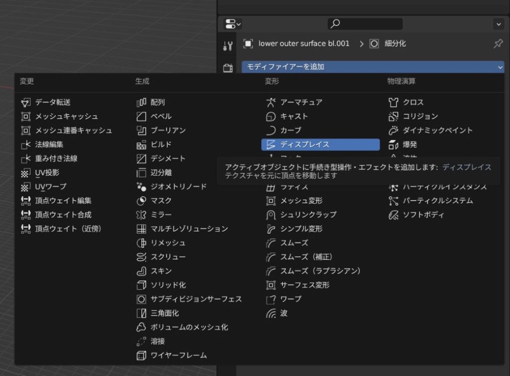 どんな変形にするかを選択する。ここではディスプレイス