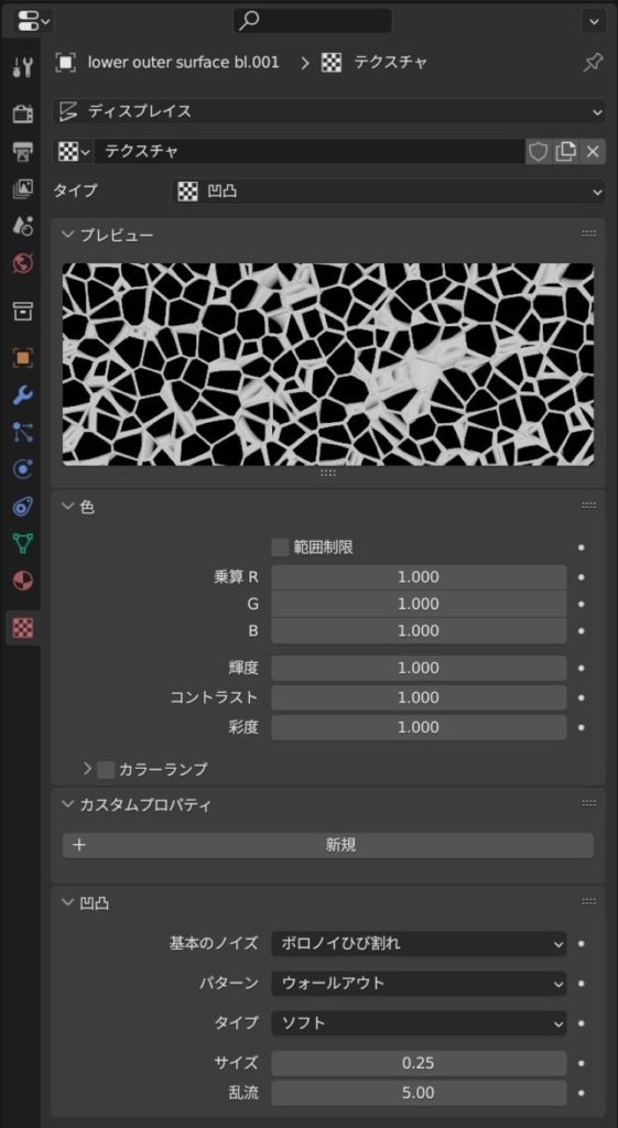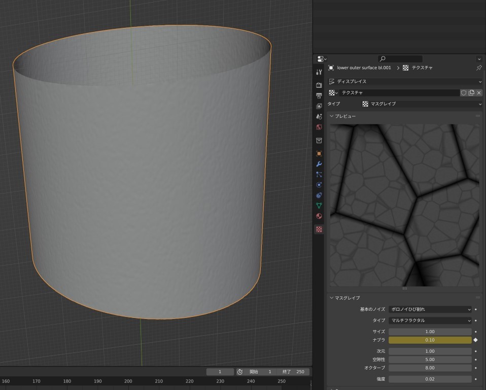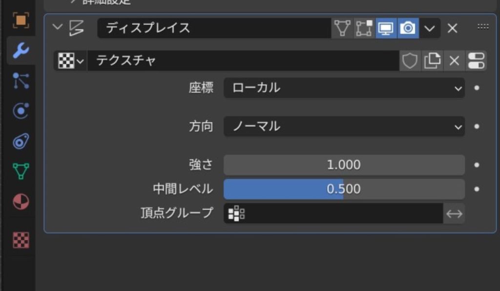 ディスプレイスでテクスチャを選び、方向性はノーマルで、強さは1中間は0.5でデコボコの強度にクセはつけない。
