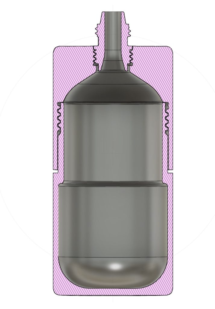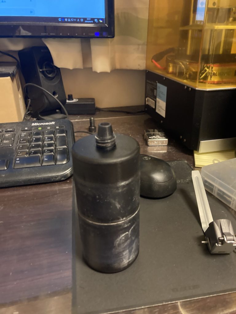 逆に、見た目のみ維持してヒューズ取付基部のネジとBB弾を注ぐノズルまで一気に出力してみた。ヒューズはBBボトル用型グレネードのものを使用